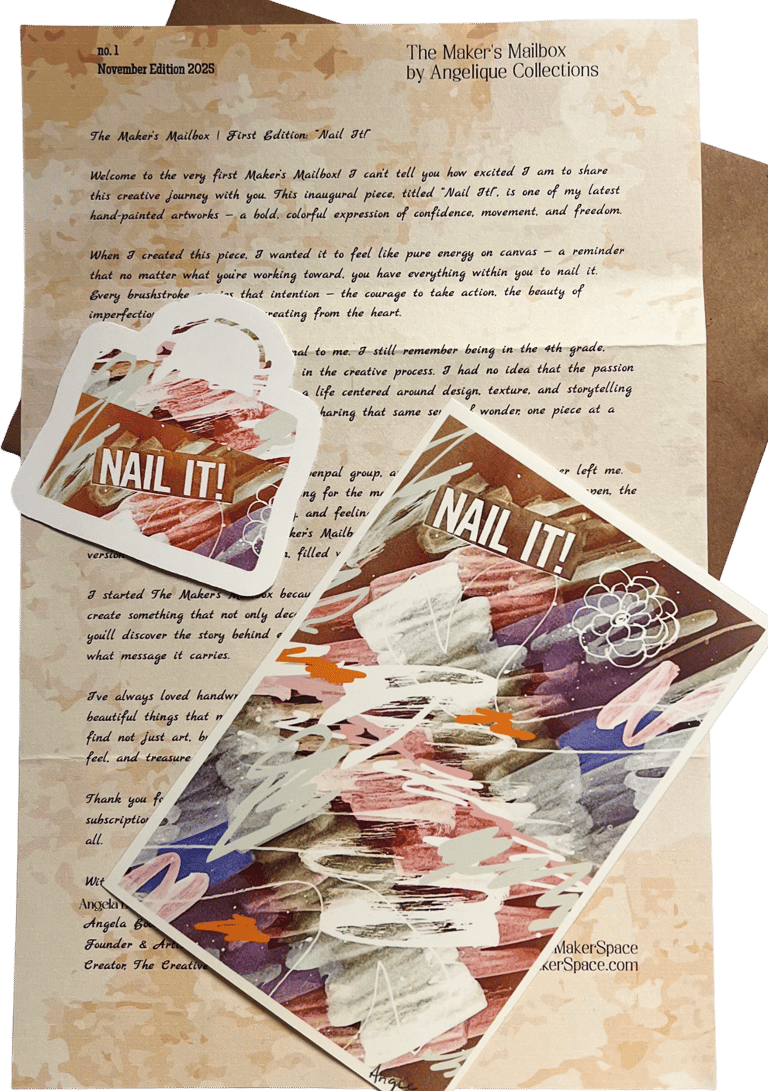 Angelique Collections has teamed up with The Creative Maker Space to bring you something truly special — The Maker’s Mailbox.
